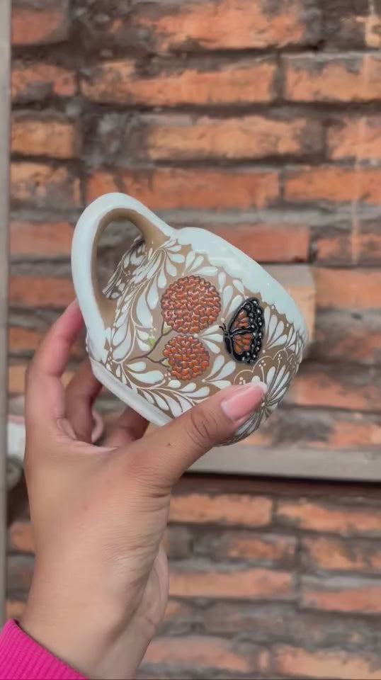 Inspired by the sacred beauty of Día de Muertos, this handmade set includes one heart-shaped mug and one matching plate. Each adorned with delicate cempasúchil blooms and a mariposa to guide the soul. “Susurro de Cempasúchil” is an offering in itself, a quiet moment of remembrance with every sip.